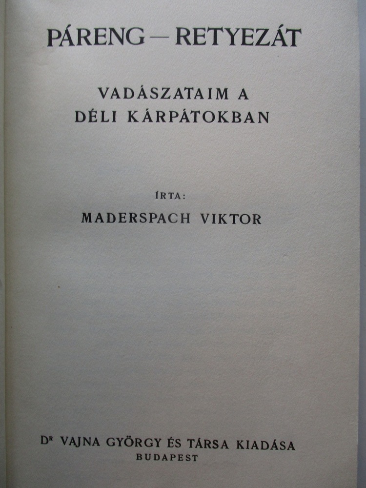 Vadászataim a Déli-Kárpátokban. 1935 . Dr. Vajna György és Tsa. Bp. 200 oldal, ff képekke. Kiadó egészvászon kötésben, illusztrált kötéstáblával, szép állapotú, megkímélt példány. Maderspach egyik legritkább könyve.