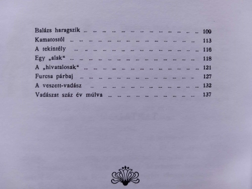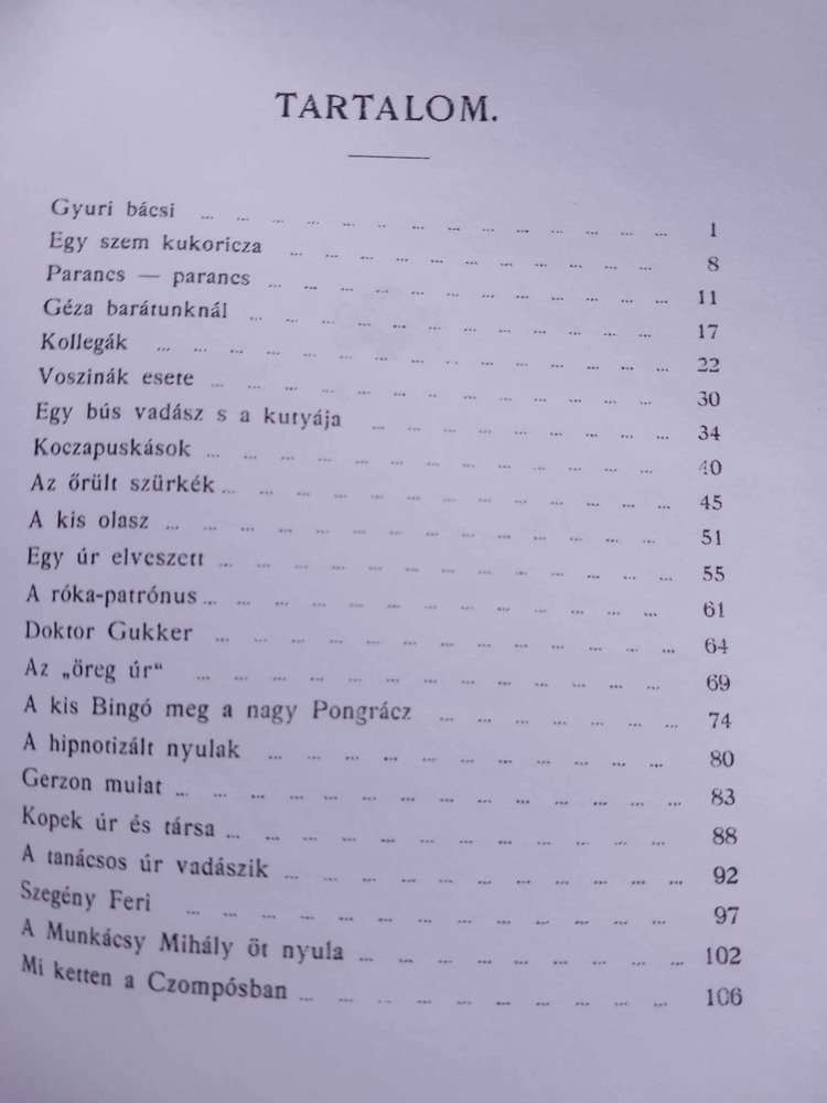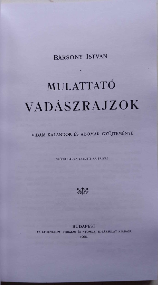 "Az életet irányító komoly dolgokon kívül két szenvedély van, ami különösen összeköti azokat, akikben közös. Az egyik a kártya, a másik a vadászat. Csakhogy amíg a kártya többé-kevésbé az ellenfelet, - néha az ellenséget, - láttatja egymásban a játszó felekkel: a vadászat éppen megfordítva, a legkedvesebb pajtási, gyakran baráti viszonyt kelti és erősíti meg. A vadásztársaságok rendszerint vidámak, tréfálni szeretők, móka- és adomakedvelők. Mindenki átél valamit a vadászéletében, ami mulatságos, és aminek az elmondásával meg lehet nevettetni, s aki maga nem dicsekedhet vele, hogy érdekes vagy bolondos esetei voltak: legalább hallott effélét, s azt adja tovább jókedvűen. Ez a könyv ilyesmik gyűjteménye. Tréfás vadászesetek, kalandok, s adomajellegű apróságok vannak benne. Mulattatni kívánom vele az olvasót.Jókedvet kívánok mindenkinek."