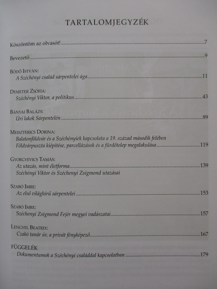 Az olvasó többek között megismerheti a Széchenyi család sárpentelei ágát, Széchényi Viktort mint politikust, a Széchényiek kapcsolatát Balatonföldvárral, de olvashatnak Széchényi Viktor és Széchenyi Zsigmond utazásairól, illetve „az első világhírű sárpenteleiről”, aki nem más, mint Széchényi Dénes fogathajtó, valamint a „világvadász” Széchenyi Zsigmond Fejér megyei vadászatairól is. Utóbbi két témát a nemrég elhunyt Szabó Imre címzetes levéltári igazgató, vadászattörténész dolgozta föl.