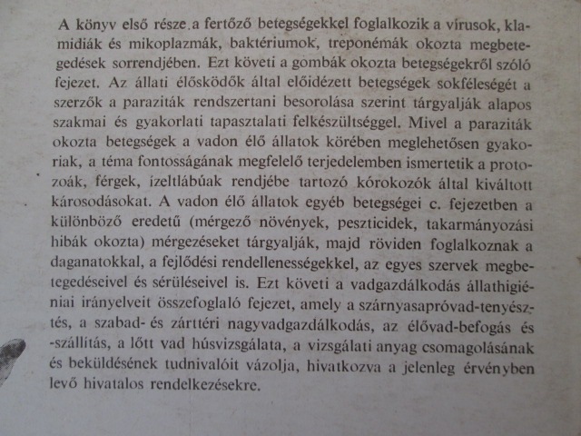 Megjelenése óta, a legátfogóbb, legteljesebb alapmű a hazai vadállományunk egyedeinek betegségeiről, azok kezeléséről, megelőzéséről, felismeréséről. Messzemenő részletességgel trágyalja az összes létező vatbetegséget. A mintegy 5 oldalas tartakomjegyzék magáért beszél, de a kötet végén tárgymutatóval, kereshetőek az adott betegségek, kifejezések. Nem csak a betegségeket, de a vadgazdálkodás állathigiéniai elveit, metódusait az élővadbefogás, szállítás gyakorlatát, a lőtt vad kezelését, szállítását, húsvizsgálatát is részletesen bemutatja.