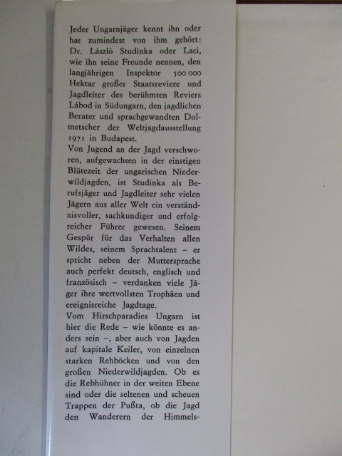Studinka László kultikus vadászkönyve német nyelven is megjelent 1977-ben.. Ennek első kiadása ez a kötet. 252 oldal, egészvászon kötésben, jó állapotban. Ritka!