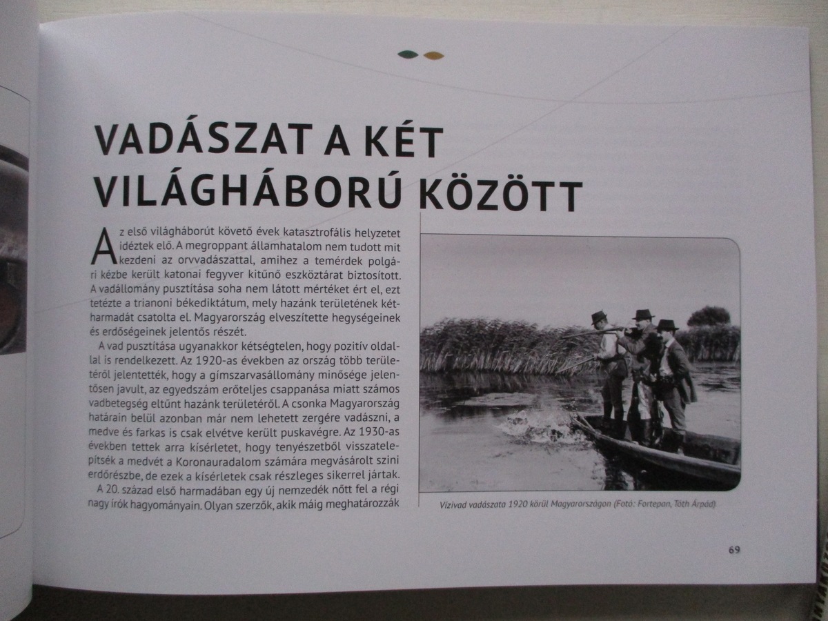 A Magyar Mezőgazdasági Múzeum kiadásában megjelent 283 oldalas kötet közel fele mutatja be a magyar vadászattörténetet, de képet ad arról is, hogy milyen kihívásai vannak ma a vadászatnak, merre tartunk, követjük-e elődeink nyomdokait. Nagy örömünkre szolgál, hogy a hagyományos vadászati módok jeles szakértői is egy-egy tanulmánnyal járultak hozzá a tartalomhoz: Turcsányi Zoltán a solymászatról, Ambrózy Árpád a vadászíjászatról, Keresztes János az agarászatról. Tűzfegyverek, hidegfegyverek, vadászijászat, vadászati módok, solymászat, agarászat, főúri vadászat, lőfegyverek fejlődése stb. Átfogó, szerteágazó ismeretet ad, a vadászat teljes egészéről, illusztris albumba foglalva.