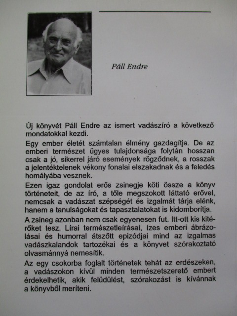 Páll Endre egyik ritkább kötete 1997-ben, mintegy 23-éve jelent meg, és akkor is nagy népszerűségnek örvendett. Óriási tudása, sajátságos írásmódja, természetszeretete és a vad iánti tisztelete, például szolgál az utókor számára. A tizenhét elbeszélést élvezet olvasni.