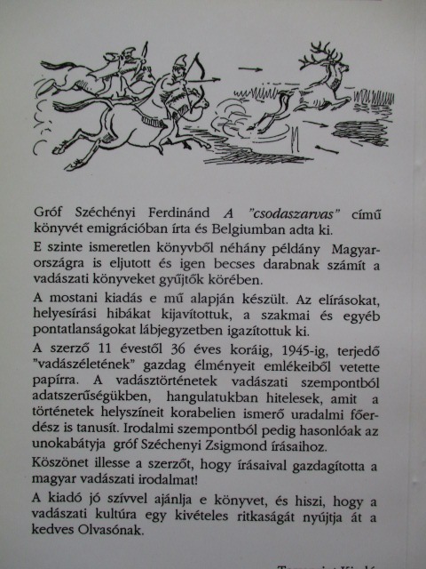 Gróf Széchényi Ferdinánd A "csodaszarvas" c. könyvét emigrációban írta és Belgiumban adta ki. E szinte ismeretlen könyvből néhány példány Magyarországra is eljutott és igen becses darabnak számít a vadászati könyveket gyűjtők körében. Ez a kiadás e mű alapján készült. Az elírásokat, helyesírási hibákat kijavították, a szakmai és egyéb pontatlanságokat lábjegyzetben igazították ki. A szerző 11 évestől 36 éves koráig, 1945-ig, terjedő "vadászéletének" gazdag élményeit emlékeiből vetette papírra. A vadásztörténetek vadászati szempontból adatszerűségükben, hangulatukban hitelesek, irodalmi szempontból pedig hasonlóak az unokabátja gróf Széchenyi Zsigmond írásaihoz.