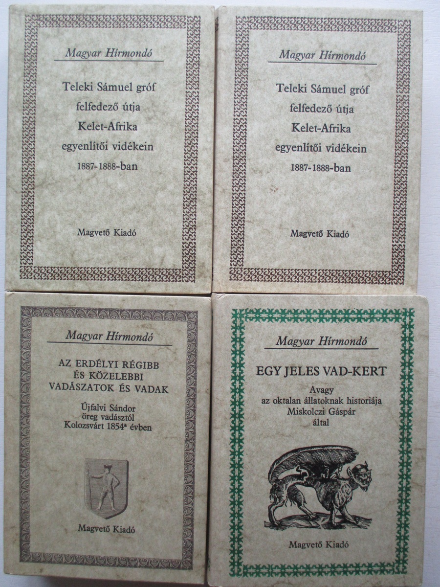 A Magvető Kiadó Magyar Hírmondó sorozatában jelentek meg ezek a klasszikus, régi vadászkönyvek, amelyek szép egységes sorozatban, pergamen-utánzatú kötésben láttak napvilágot. Ezek a művek eredeti kiadásban szinte hozzáférhetetlenek, aukciók kurrens darabjai. Az elős magyar vadászkönyvek egyikeként tartják számon. Minden kötet jó állapotban.