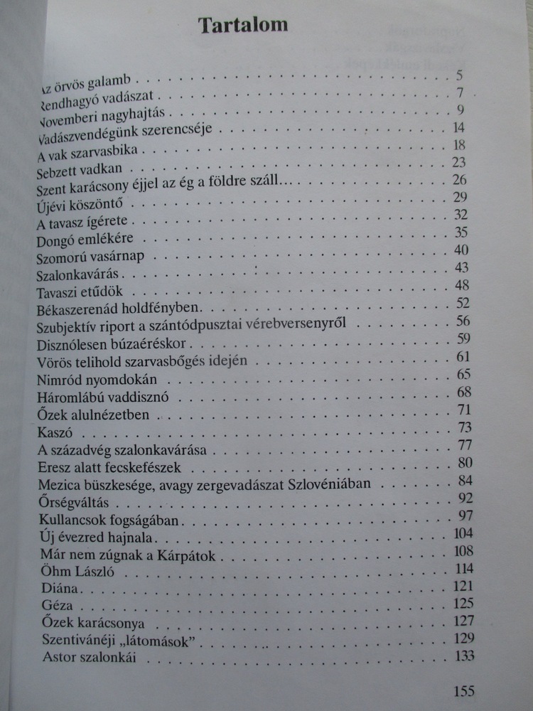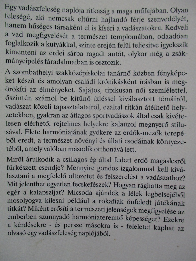 A szerző, Varga Aladárné, sajátos, tipikusan női szemlélettel, őszintén számol be kitűnő ízléssel kiválasztott témáiról, vadászat közeli tapasztalatairól, ezáltal ritkán átélhető helyzetekben, gyakran az átlagos sportvadászok által csak kivételesen elérhető, rejtelmes helyekre kalauzol megnyerő stílusával.