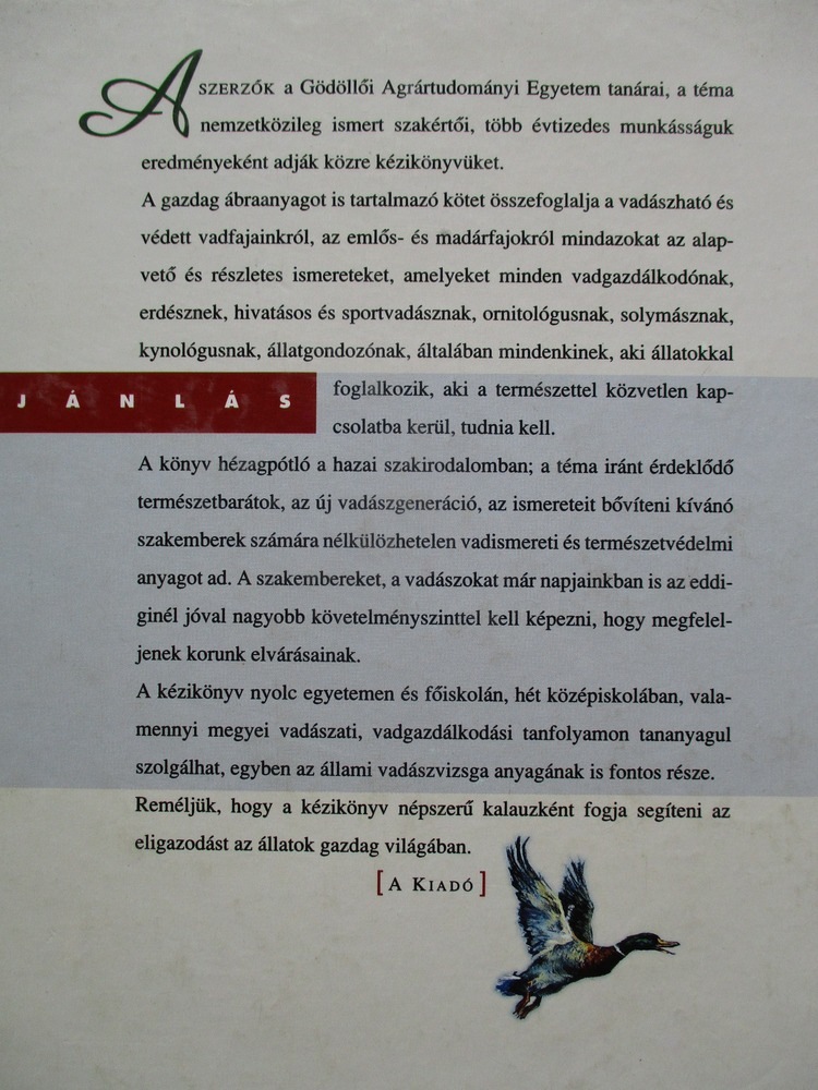 A két író nemzetközileg elismert szakember, több évtizedes munkájukat adják közre ebben a kézikönyvben. A gazdag ábraanyagot is tartalmazó kötet összefoglalja a vadászható és védett fajainkat, beleértve a madárfajokat is és mindazon részletes ismereteket, amelyet minden vadgazdálkodónak és vadásznak tudnia érdemes A könyv hézagpótló hazai szakirodalom, egy kiadást ért meg, manapság nagynéha bukkan fel belőle eladó példány.