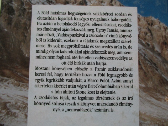 A Föld hatalmas hegységeinek sziklabércei zordan és elutasítóan fogadják fenséges nyugalmuk háborgatóit. Ha aztán a betolakodó legyőzi ellenállásukat, csodálatos élménnyel ajándékozzák meg. Ugray Tamás, mint az már előző "Vadászpuskával a csúcsokon" című könyvéből is kiderült, ezeknek a tájaknak megszállott szerelmese. Ha sok megpróbáltatás és szenvedés árán is, de mindig olyan kalandokkal ajándékozzák meg, ami semmihez nem fogható. Mérhetetlen vadászszenvedélye az ott élő birkák után hajtja. Mostani könyvében először a Pamír sziklavadonát keresi fel, hogy terítékre hozza a Föld legnagyobb és egyik legritkább vadjuhát, a Marco Polót. Aztán annyi sikertelen kísérlet után végre Brit-Columbiában sikerül a hőn áhított Stone kost is elejtenie. A csodálatos tájak, az izgalmas történetek és az író könnyed stílusa teszik a könyvet maradandó élménnyé, a "nemvadászók" számára is.